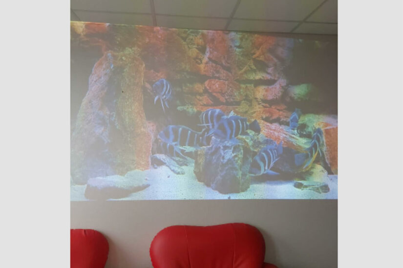 Il s’agit d’un projecteur intelligent monté sur roulettes capable de diffuser des images et des vidéos apaisantes, accompagnées de musique, directement sur les murs ou le plafond des chambres.