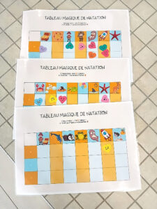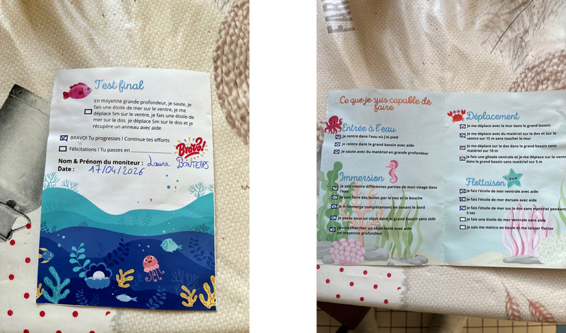 Munis des badges d’accès, tout le monde passe au vestiaire pour se rendre au bord du petit bassin. Laura, la maître-nageuse diplômée APA, et Maël apprenti maître-nageur, nous attendent. Laura explique l’organisation de la semaine et distribue aux parents les feuilles où ils pourront noter avec leurs enfants les compétences acquises à chaque séance.